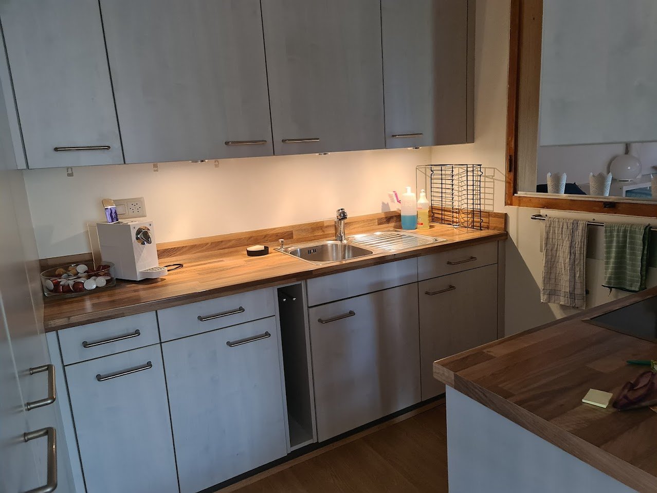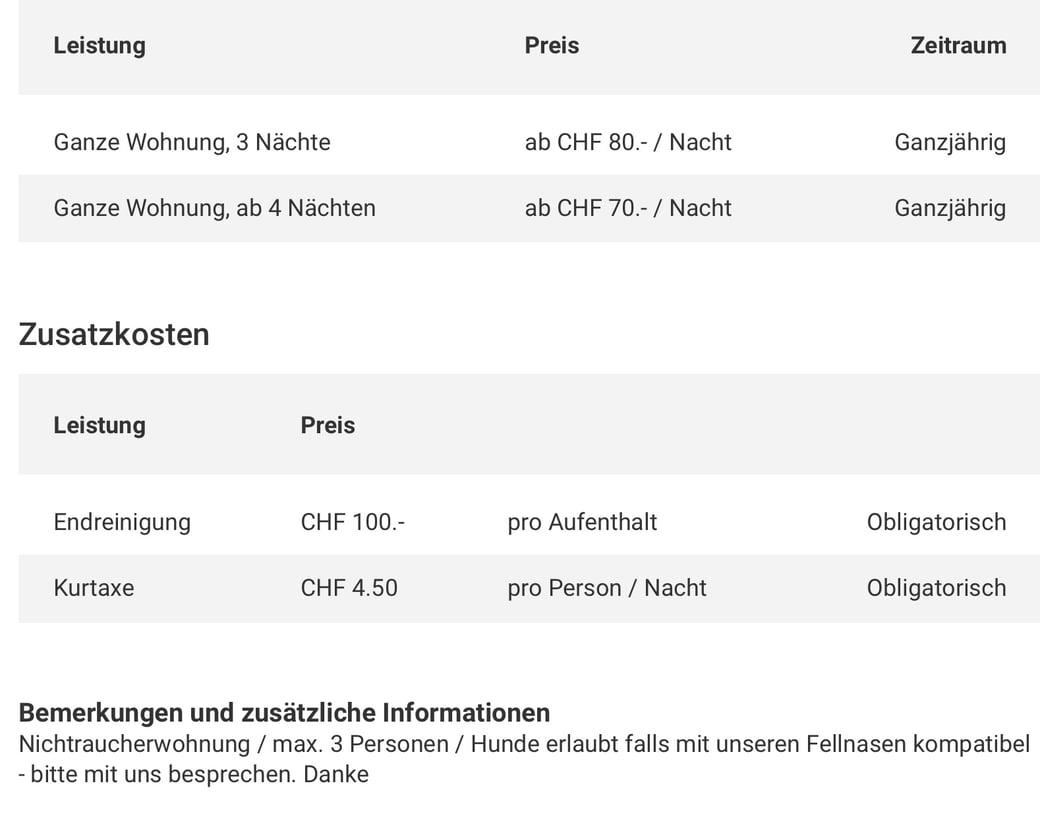 Die Wohnung ist teils neu möbliert und hat neue Küchengeräte. Kaffeemaschine sowie Wasserkocher sind vorhanden. 3 Betten, inkl. Bett- Küchen-und Frotteewäsche. Das W-LAN reicht für Handy und Laptop. Ein Parkplatz für ein mittelgrosses Auto ist ebenfalls vorhanden.
